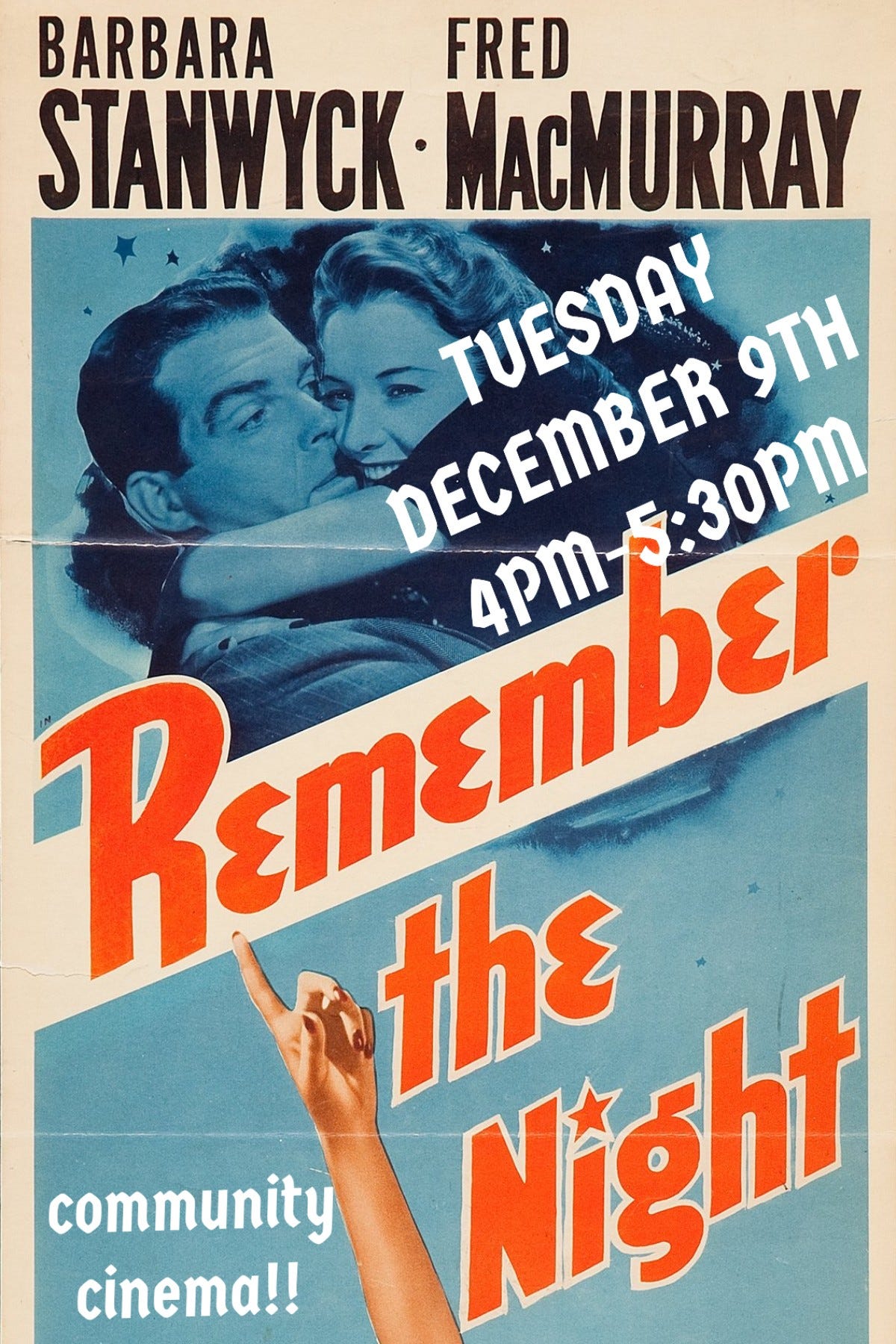 Join us for a screening of the classic film Remember the Night to celebrate the holidays on Tuesday, Dec 9 at 4pm! Lee Leander is a petty shoplifter on trial for swiping an expensive bracelet from a jewelry store. When her trial is postponed until after New Year’s, sympathetic Assistant District Attorney John Sargent bails her out of jail. Together, they find themselves falling in love when he invites her to his family’s home for the holidays where she discovers a love she’s always wanted.